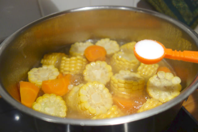 Efter 30 minuter, häll ner majsen och moroten och koka under lock i ytterligare 15 minuter.